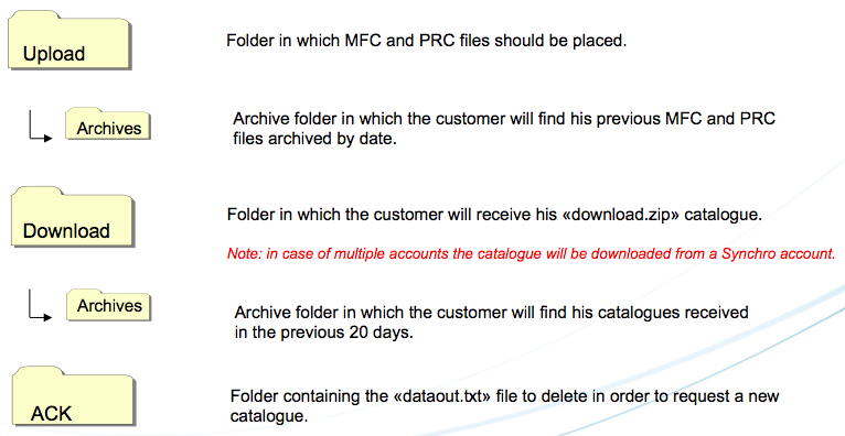- The request of a new catalogue is initiated by the customer by deleting the file named «dataout.txt» placed in the folder named «ACK» in the ftp account.